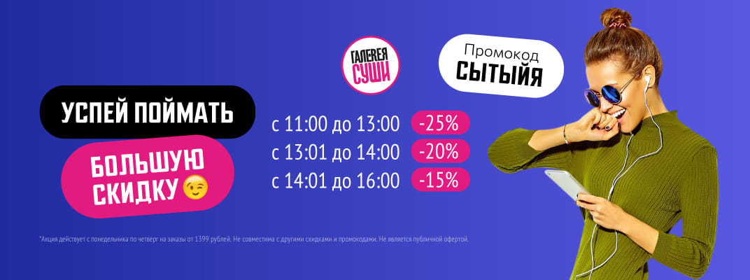 *Акция действует на заказы от 1399 рублей. Предложение распространяется на основное меню. Не совместимо с другими скидками и оплатой баллами. Не действует в праздничные дни. Не является публичной офертой.